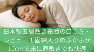 生活 日本製五層敷き布団の口コミ・レビュー!固綿入りのふかふか10cmで床に直敷きでも快適 厚さ10cmの日本製・固綿入り敷布団をレビュー。床に直敷きでも底付きしにくく、腰の負担を軽減しやすい設計。抗菌防臭・防ダニ加工で子どもやアレルギーが気になる人にも安心。口コミの評判やデメリット、収納やへたりにくさなど買う前に気になるポイントをわかりやすく解説します。 生活